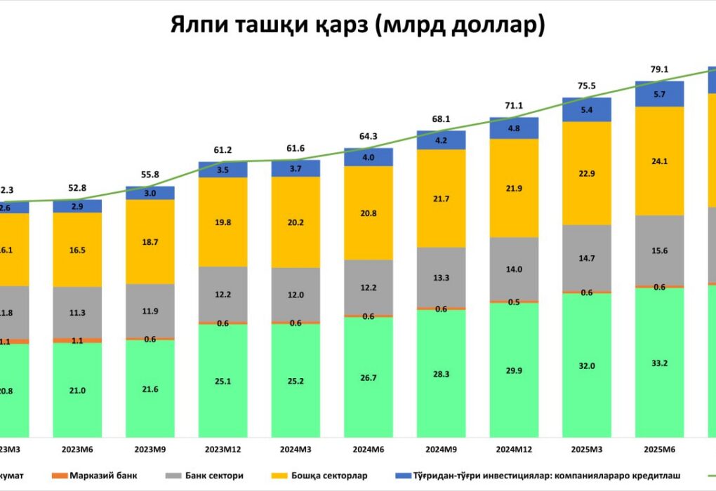 Ўзбекистон ташқи қарзи 82 млрд долларга яқинлашди: қарз жалб қилиш суръати тезлашмоқда